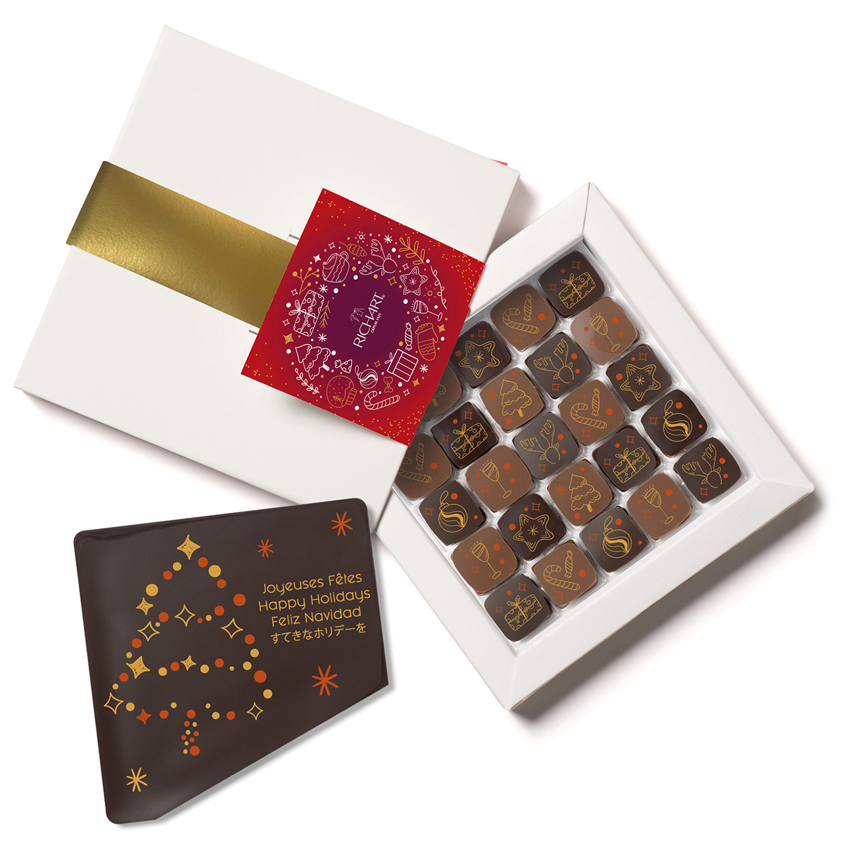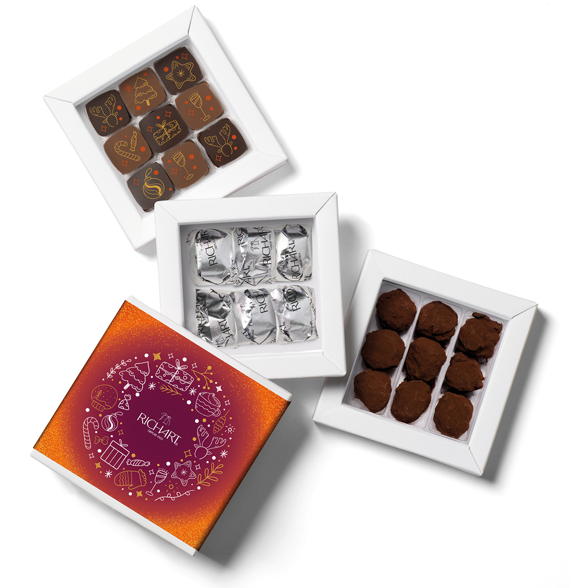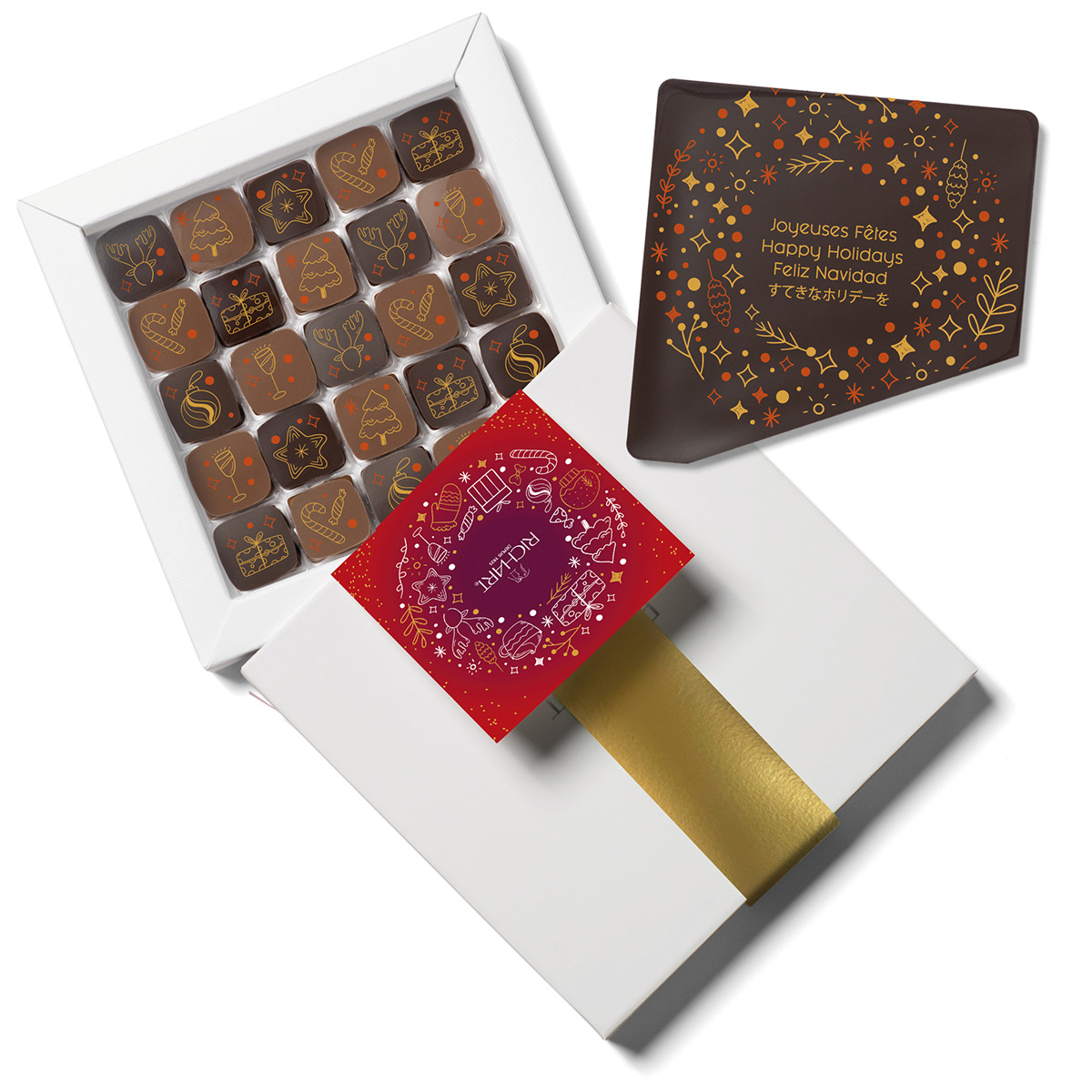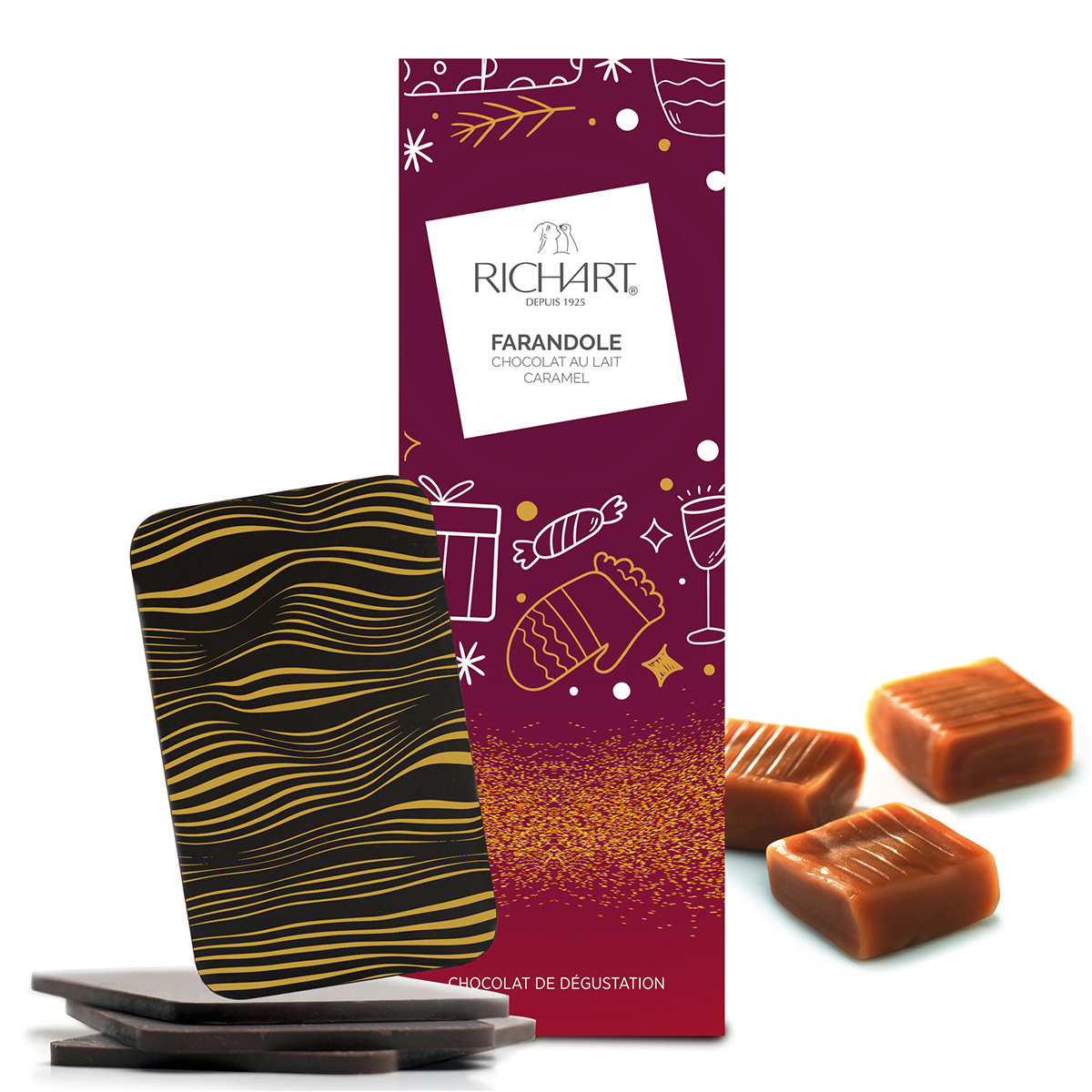 Deuxième collaboration avec la Maison Richart, créateur de chocolats haut de gamme. Il fallait ici designer la collection Farandole pour Noël 2025. Cela comprend le graphisme sur les différents chocolats en tenant compte des contraintes d’une impression alimentaire, les fourreaux, tablettes, cartes, PLV etc…